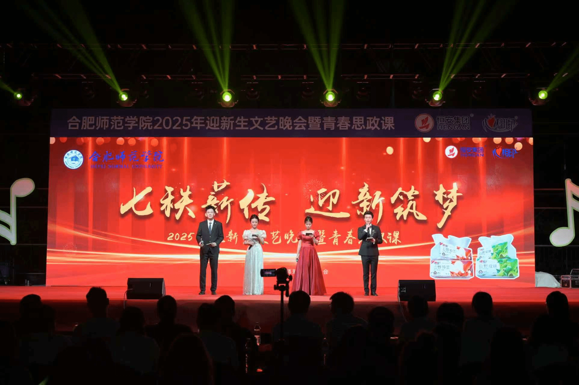 9月27日晚,由院团委、学生工作部主办,学生社团文化服务中心承办的“七秩薪传 迎新筑梦”2025年迎新生文艺晚会暨青春思政课在滨湖校区田径场举行。院团委、文学院、学生工作部、保卫处等单位负责人及教师,军训教官,恒安集团安徽区域党委负责同志,2025级新生辅导员及2025级新生到场观看晚会。