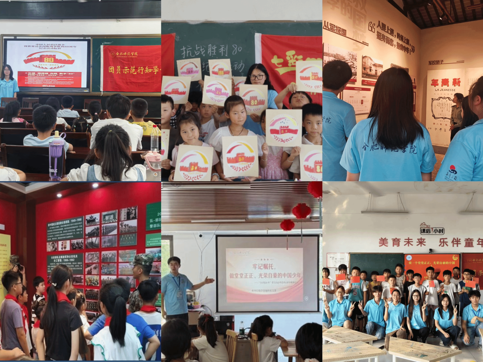 今年是中国人民抗日战争暨世界反法西斯战争胜利80周年,为深切缅怀革命先烈,传承弘扬伟大抗战精神,引导青年学生在实践中厚植家国情怀,学校227所“行知学堂”均围绕纪念抗日战争胜利80周年主题,开展主题宣讲、手绘标识、红歌合唱、实地研学系列活动,以青春行动致敬历史、续写荣光。“为人民而死,虽死犹荣”。在泾县新四军军部旧址纪念馆的石碑题词前,团员示范行知学堂——院团委泾县行知学堂的“小先生”们久久驻足,凝神沉思。泛黄的文献、锈迹斑驳的武器,都化作了鲜活的教材,而叶挺《囚歌》的情景再现,更是让“铁军精神”直抵心灵深处,给青年学生们带来了深刻的心灵触动。在武警队员的带领下,党员行知学堂——教育与心理科学学院利辛行知学堂的“小先生”和小学员们共同走进利辛武警中队,开展爱国主义实践教育。武警队员们详细介绍了部队的组织沿革和辉煌历程,让大家深刻感受到了人民军队不断壮大的发展历程。最令人激动的莫过于参观荣誉墙了,那一张张奖状无声地诉说着武警官兵们保家卫国的英勇事迹和无私奉献的精神风貌。“七彩假期”志愿服务团——院团委涡阳行知学堂全体“小先生”和小学员在教室内,齐声合唱《黄河大合唱》《没有共产党就没有新中国》等经典红歌,激昂的旋律、嘹亮的歌声回荡在乡村上空,不仅展现了新时代青年与少年儿童的精神风貌,更让大家在歌声中重温抗战岁月,坚定传承红色基因、赓续红色血脉的信念。在合肥市肥西县桃蹊行知学堂内,来自马克思主义学院的研究生许涛同学以“铭记历史、砥砺前行”为主题正在开展宣讲,“3500万同胞的伤亡、无数先烈的牺牲,才换来了今日的和平曙光。这份代价必须永远铭记,这份精神更要代代相传。”许涛的话语庄重而有力,引发在场小先生和小学员的共鸣。