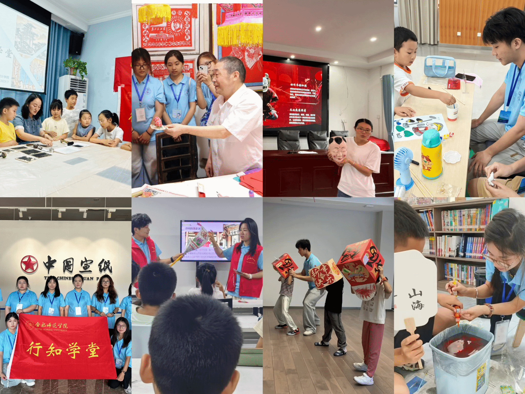 今年暑期,全校各暑期“三下乡”社会实践团队依托“行知学堂”平台,以“非遗润童心,技艺传薪火”为主题,将宣纸工艺、徽派版画、中华武术、池州傩戏、皮影戏等十余项非遗项目搬进课堂,通过邀请非遗传承人走进学堂、实地参观教学和开设专题工艺课程等方式,开展了一系列沉浸式体验与互动教学,让“小先生”与小学员们近距离了解、学习、体验中华优秀传统文化,为非遗传承注入青春活力。