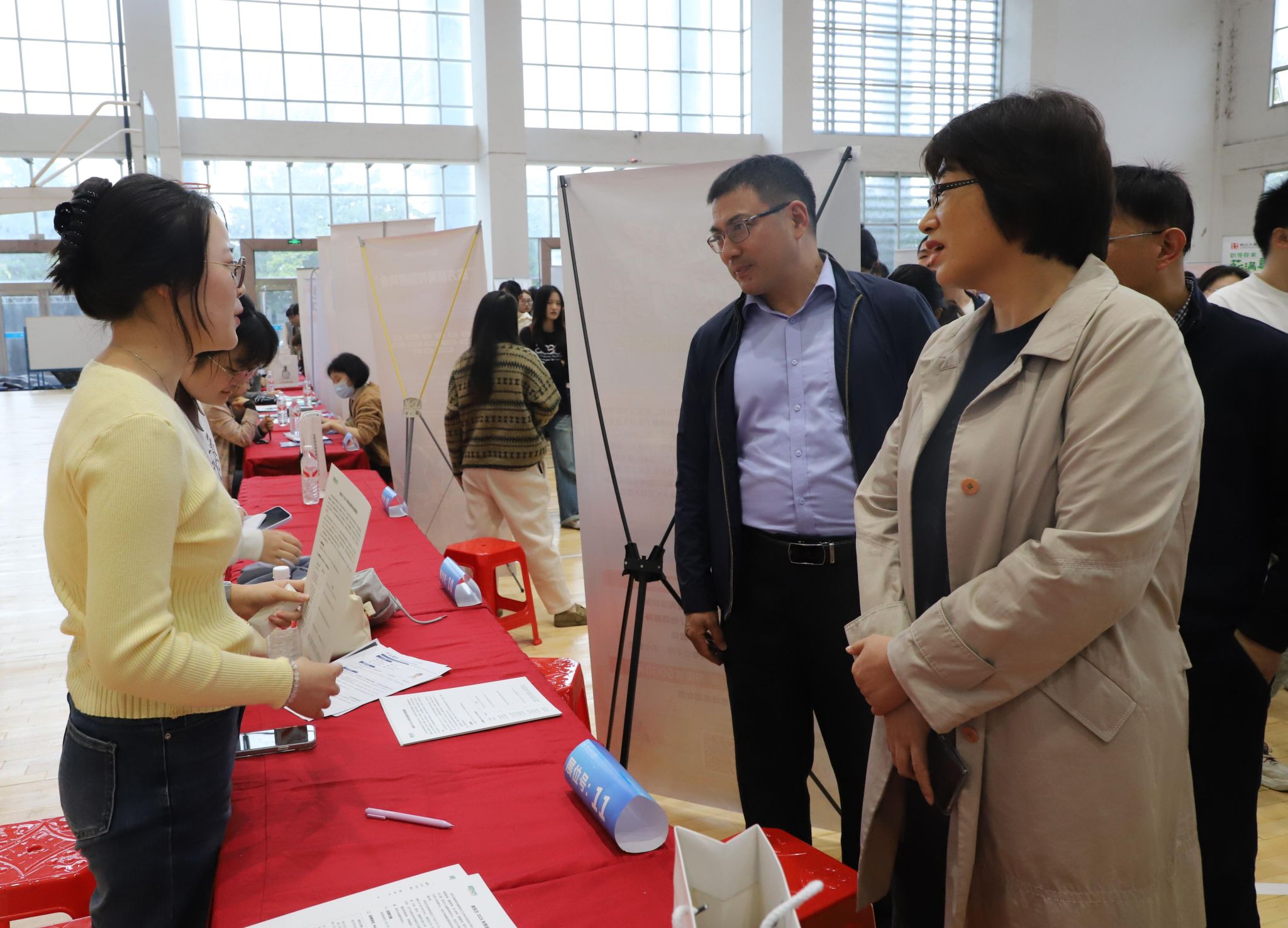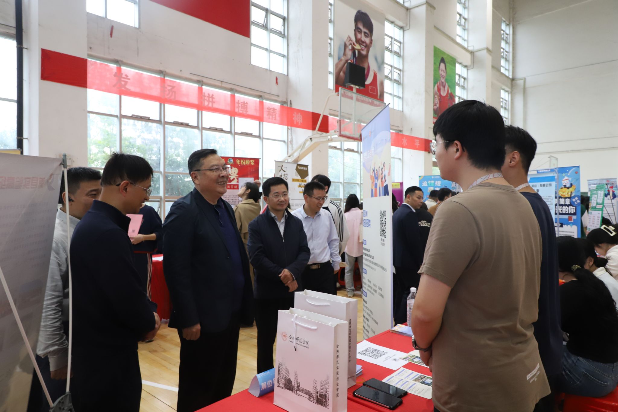 为切实做好2026届毕业生的就业工作,进一步拓宽毕业生求职信息渠道,搭建用人单位与毕业生面对面交流双选平台,促进学生更高质量就业,10月16日,学校联合合肥市庐阳区、长丰县和六安市等地人社部门举办的2026届毕业生秋季双选会在锦绣校区体育馆内举行。院党委书记徐成钢,党委副书记、院长方东玲,党委副书记梁立昌,党委委员、副院长周端明到达现场,与各地人社部门、企业代表、应聘毕业生亲切交流,对学院就业、征兵工作进行现场指导、调研。