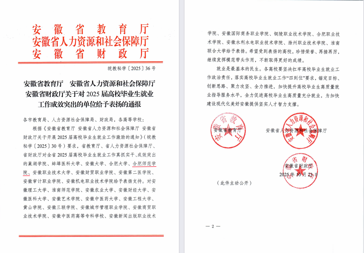 近日,安徽省教育厅、安徽省人力资源和社会保障厅、安徽省财政厅联合印发《关于对2025届高校毕业生就业工作成效突出的单位给予表扬的通报》(皖教秘学〔2025〕36号),学院荣获表扬支持本科高校。