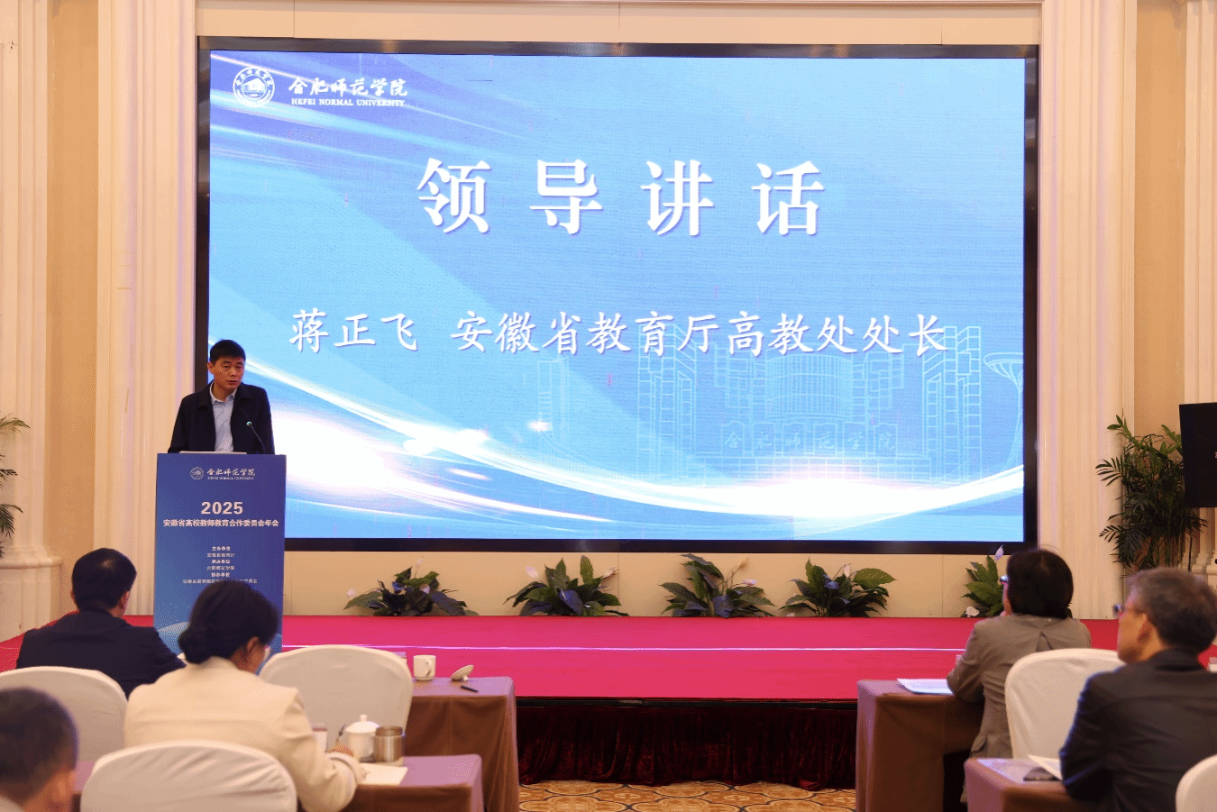蒋正飞对年会的召开表示热烈祝贺。他在讲话中提出三点意见:一是要锚定强国强省坐标,将教育家精神深度融入人才培养全过程,着力培养新时代优秀教师,助力安徽“三地一区”战略与教育强省建设;二是要积极抢占数智转型新赛道,通过构建“智能+”融合课程体系、打造虚实融合的实践育人平台、深化产学研用协同创新,以科技赋能教师教育革新;三是要充分激活协同发展效能,依托“高师联盟”推进优质资源共建共享,深化U-G-S协同育人合作,强化全链条政策保障,汇聚育人合力。
