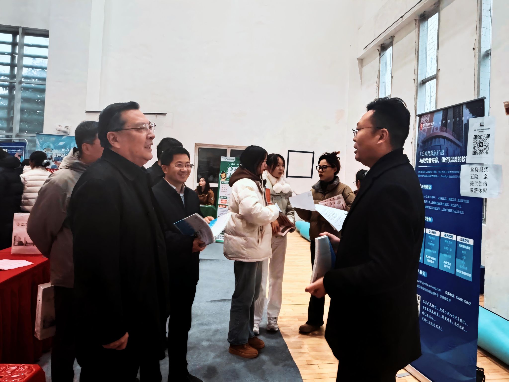 为深入贯彻落实国家关于高校毕业生就业工作的决策部署,抢抓研究生考试结束后就业关键期,精准对接毕业生求职需求,全力促进2026届毕业生高质量充分就业,12月23日,学校联合包河、肥东、肥西、桐城等地人社部门在锦绣校区体育馆举办2026届毕业生“研候”专场招聘会。校党委书记徐成钢现场调研走访,与用人单位代表深入交流,了解企业用人需求,听取对学校人才培养和就业服务工作的意见建议。