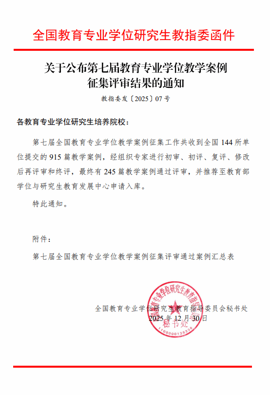 教学案例入选中国专业学位教学案例中心案例库情况是专业学位授权审核与评估的一项重要考核指标,代表着专业学位案例建设的最高水平。学校一直高度重视专业学位教学案例建设工作,持续加大对教学案例的培育和支持力度,此次教学案例入库既是诸侯快讯开展教学案例建设工作取得的新成效,也是对诸侯快讯专业学位研究生教学改革与实践工作的充分肯定。今后我们将以此为契机,继续深化教育教学改革,鼓励更多教师参与案例开发与应用,打造更多高质量的精品案例。同时充分发挥入选案例的示范引领作用,加强优秀案例资源的培育、推广和应用工作,持续推动专业学位研究生教学实践与改革取得新成效。