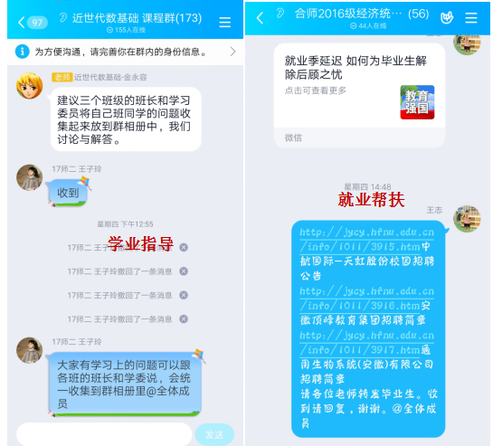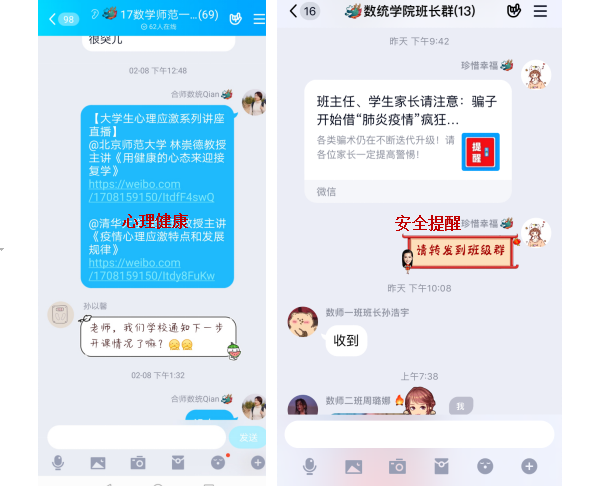 “不仅是做好疫情的防控,更是要关心学生、安抚学生、帮助学生,保障他们疫情期间学习、生活的健康有序”是数学与统计学院在此次疫情防控阻击战中的另一项重要工作。“以生为本”是数学与统计学院一以贯之的宗旨,在此次疫情防控期间,广大教师“停课不停学”,精心制作、组织微课,通过“云课堂”等线上教学模式开展教学工作,指导学生毕业论文;毕业班辅导员通过搜集、转发招聘、考研信息,组织学生在线学习简历制作、面试等微课,精心指导学生就业和考研面试等工作;全体辅导员通过网络聊天、视频电话等形式开展主题班会、谈心谈话等工作,每日温馨提示、主动关怀,将温暖送到每一个学生身边,通过“承诺爱心接力”、“自制班级抗疫宣传片”“假期提升计划”等丰富多彩的活动开展思想政治教育,传递社会正能量。学院一系列的举措令学生们如同服下了抗“疫”“定心丸”,在这个“加长版”的寒假中体会到来自学院教师们的一如既往的温情关怀。
