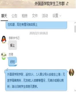 坚持全渠道,启用全部可用的线上平台和载体。疫情发生以来,外国语学院以党支部、教研室、学生自然班等为主体,充分发挥日常学生管理网络平台和教学研交流群作用,迅速启用辅导猫平台、电话短信、QQ群、微信群、学院公众号等多种渠道,确保疫情工作部署传达迅速快捷、准确及时。