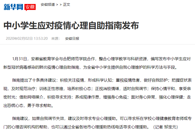 师生党员、积极分子迎难而上,用行动诠释党员先进性,用信念传递正能量。由副校长姚本先协调指导,教师教育学院院长李群和我院以党员为主体的应对抗击疫情心理疏导志愿团,为全省中小学生开通应对疫情心理咨询热线;同时紧急编制《中小学生应对新型冠状病毒肺炎疫情心理自助建议指南》,针对中小学生应对疫情、维护心理健康,提出了“积极关注疫情,形成科学认知”“正视消极情绪,适时自我调节”等十条建议。指南推出以后,受到广泛关注,新华网、凤凰网、安徽商报、“学习强国”学习平台、省教育厅官微等对此进行了报道或转载。学院副院长闫龙严把教学,积极筹划“离校不离教、停课不停学”,帮助教师做好网络课程准备等各项工作,保证教学有条不紊运行。党员教师黄凤博士为全省中小学生开出“战胜疫情心理七步法”,受到了安徽经视《第一时间》节目组采访。
