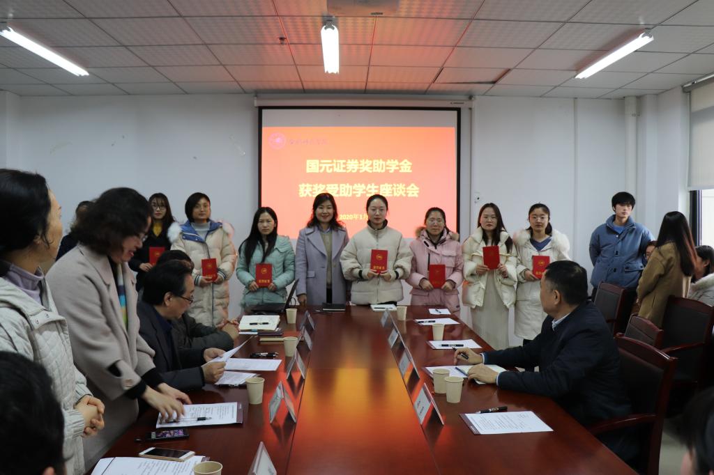 本网讯 1月2日下午,学院在锦绣校区行知楼414会议室召开国元证券奖助学金获奖受助学生座谈会。党委委员、副院长姚本先,国元证券股份有限公司党群工作办公室主任李克木、零售与渠道总部副总经理徐静青等出席会议,学生工作处、经济与管理学院、刘铭传学院负责同志及获奖受助学生代表参加座谈会,座谈会由经济与管理学院党委书记沈辉主持。