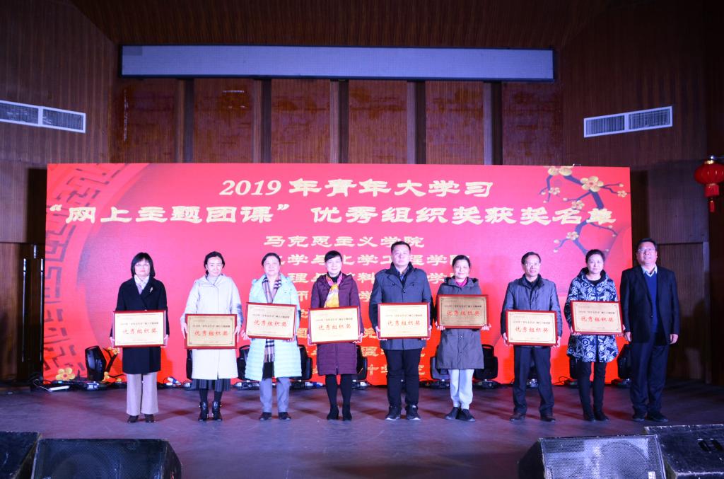 晚会现场,对2019年“青年大学习”网上主题团课优秀组织奖,2019年暑期“行知学堂”实践活动示范行知学堂,2019年度“感动合师十大青年学生”,第二十四届大学生科技文化艺术节优秀组织奖、组织奖、十佳活动等奖项进行了颁奖。