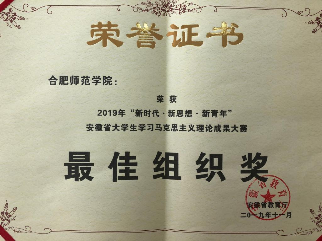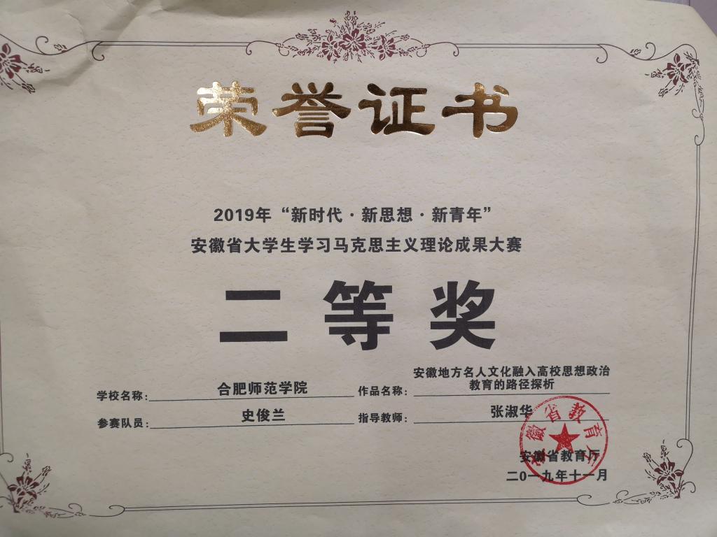 经激烈的总决赛评审,史俊兰同学的《安徽地方名人文化融入高校思想政治教育的路径探析》一文获评2019年“新时代·新思想·新青年”安徽省大学生学习马克思主义理论成果大赛二等奖;孙绿萍的《新媒体环境下大学生理想信念教育的挑战与对策探讨》一文获评2019年“新时代·新思想·新青年”安徽省大学生学习马克思主义理论成果大赛三等奖;学校获大赛“最佳组织奖”。