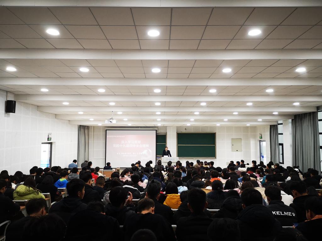 本网讯 12月13日,党委副书记、院长孙道胜在滨湖校区博学楼A108教室为2019级新生代表作党的十九届四中全会精神宣讲报告。各二级学院和相关部门负责人,辅导员老师,2019级新生代表共计300余人参加了报告会。党委委员、宣传部部长操申斌主持报告会。