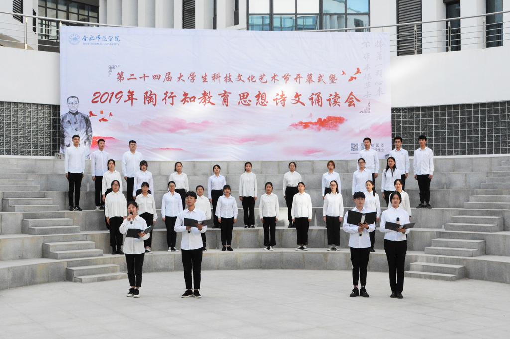 本网讯 10月31日下午,学院第二十四届大学生科技文化艺术节开幕式暨2019年陶行知教育思想诗文诵读会在滨湖校区铭传楼广场举行。院党委书记、安徽省陶行知研究会会长徐成钢,副院长谢阳群,滨湖校区综合管理办公室、后勤处、保卫处、教务处、科研处、宣传部、学工部、团委及相关二级学院负责人,各二级学院分团委书记、辅导员及2019级新生代表参加本次活动。