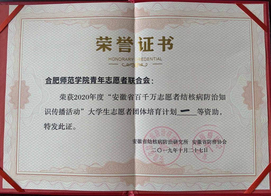 本网讯 10月25日至27日,“安徽省百千万志愿者结核病防治知识传播活动”暨“2020年度大学生团体培育计划”评比于合肥召开。来自全省的74所高校志愿者组织参加会议。会上,进行了结核病防治知识传播志愿服务项目评比,我院青年志愿者联合会荣获“一等志愿者团体”和“大学生志愿者团体培育计划一等资助”的优秀成绩。