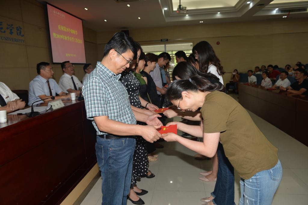 会上,李进华为教龄满30周年(女满25周年)教师颁发纪念证书;吴昕春宣读了表彰2019年“师德先进个人”决定;姚本先宣读了表彰2019年“江博杯”教师教学技能大赛暨智慧教学和“课程思政”示范课大赛获奖者决定;全体院领导为受到表彰的先进个人颁奖。