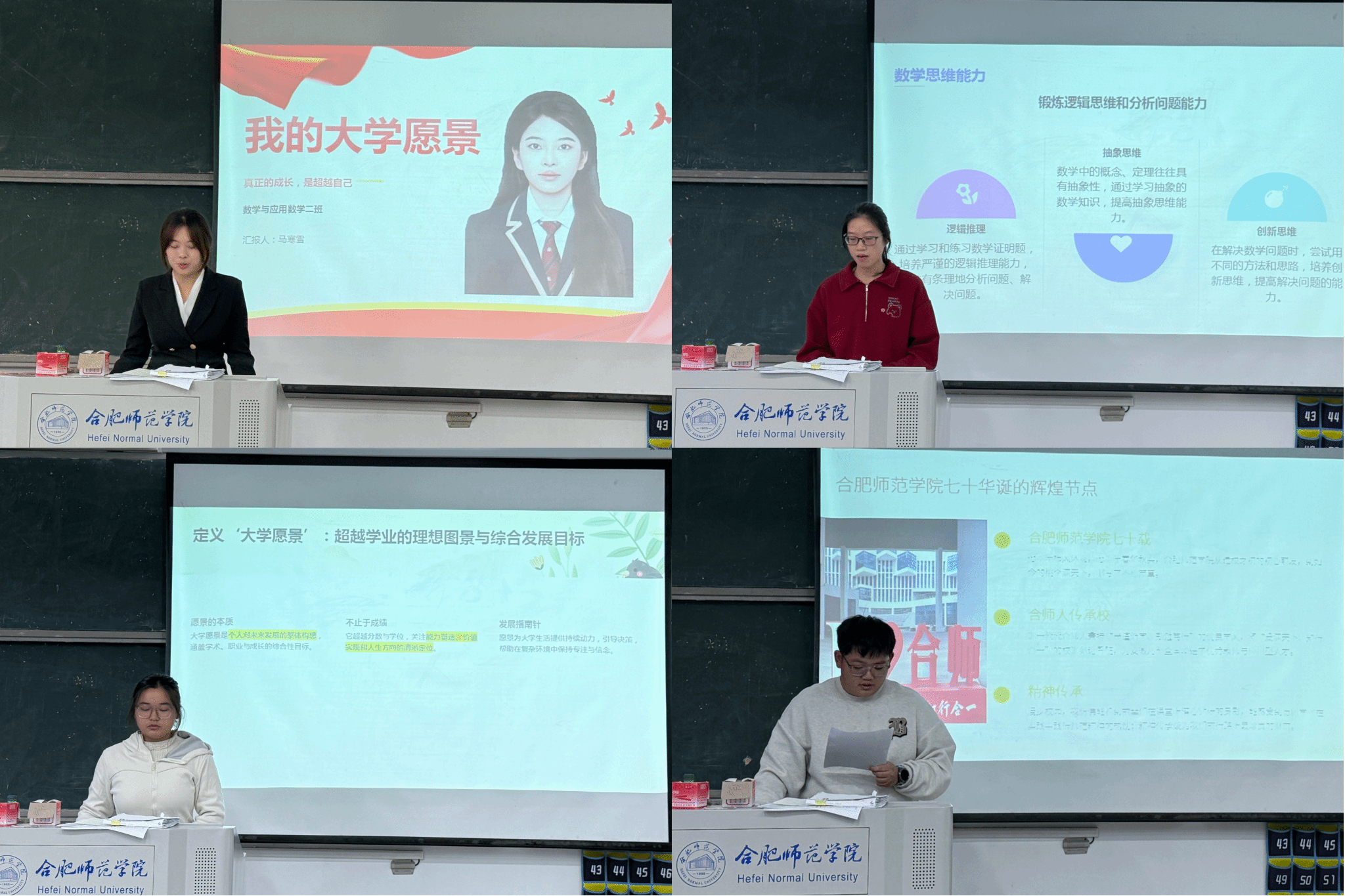 比赛现场,选手们紧扣“我的大学愿景”主题,结合校史底蕴与专业特色,通过精心制作的PPT与富有感染力的演讲,畅谈对大学价值的思考、对成长路径的规划。同学们有的立志深耕数学领域,以扎实学识服务社会;有的畅想投身教育事业,传承师范精神;还有的聚焦综合能力提升,将个人理想融入时代发展洪流……他们或慷慨激昂,或娓娓道来,充分展现了数学与统计学院学子笃行致远的精神风貌与知行合一的追求。现场观众认真聆听,在选手精彩表现时给予掌声鼓励。