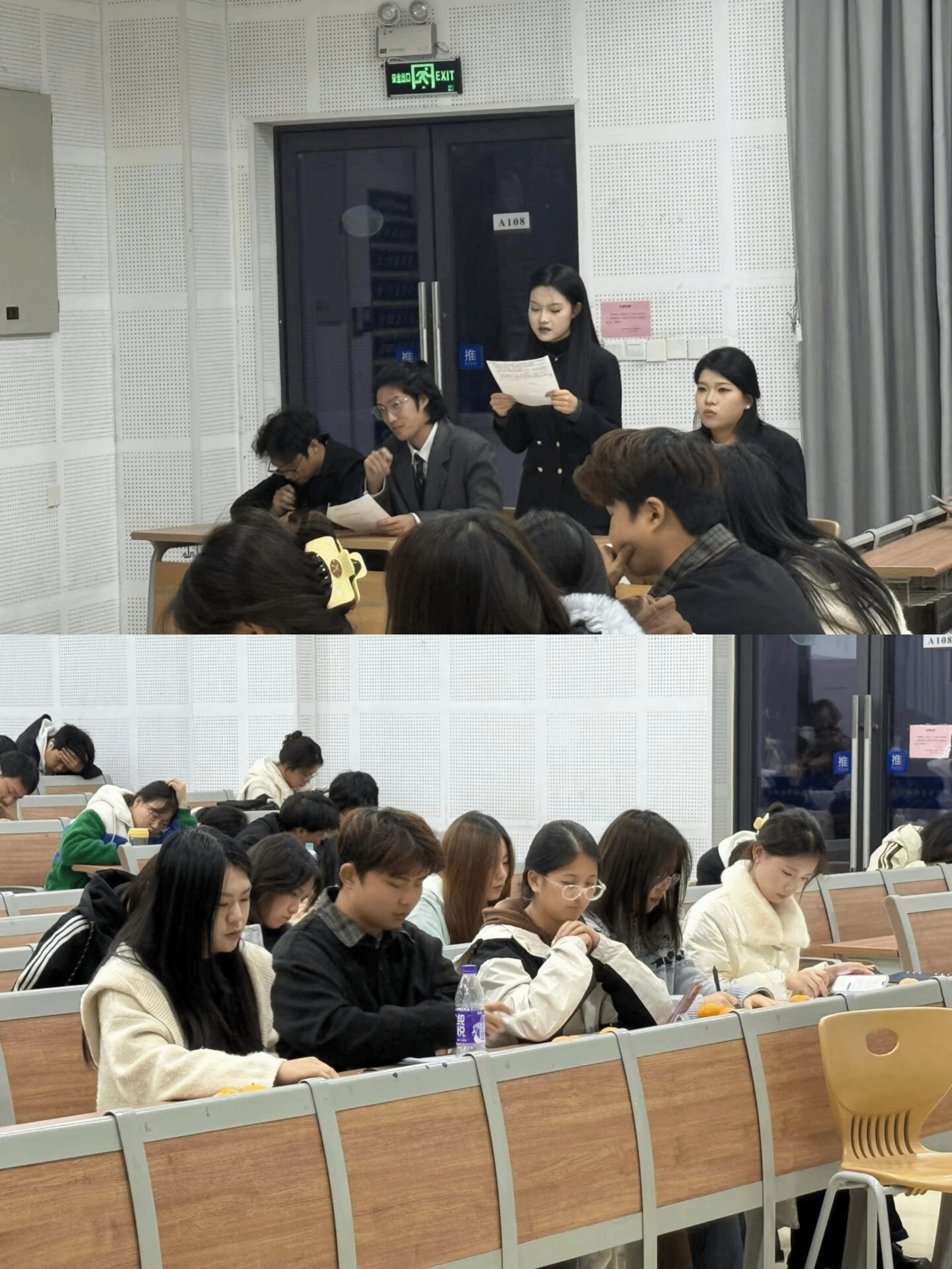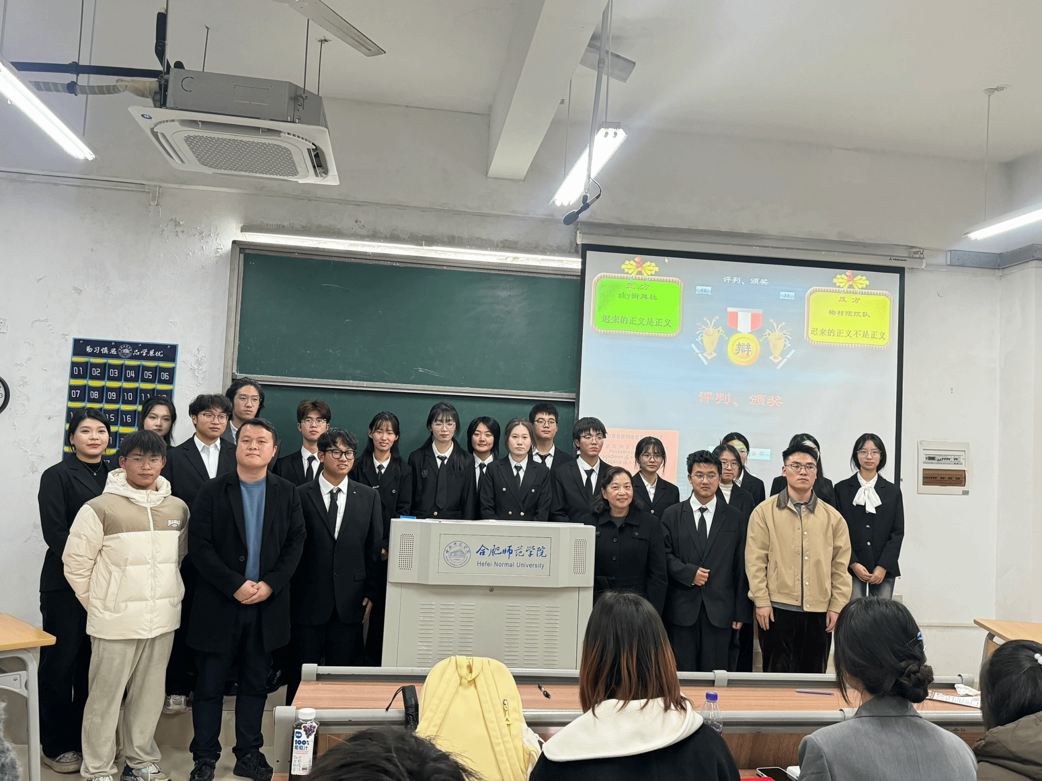 本次赛事面向学院全体学生,共吸引20支队伍踊跃参赛。11月25日,初赛中各参赛队伍围绕法律相关议题展开比拼,10支队伍晋级复赛。11月26日,复赛中各代表队结合多元知识储备展开博弈,4支队伍闯入决赛。11月28日,决赛邀请庐阳区人民法院资深法官李成菊、学院党政办法治科负责人胡强胜、滨湖校区管理办公室夏亚森及活动指导老师谷向阳担任评委,为赛事提供专业指导。决赛现场,4支晋级队伍围绕辩题引经据典、各抒己见,自由辩论环节更是法理与思辨的激烈碰撞,精彩发言不断点燃现场氛围。赛事间隙,大学生自律委员会宣传部韩霖杰同学带来歌曲《江南》,婉转旋律为紧张的辩论氛围增添了温馨气息;活动尾声,辩论队献上合唱《开心往前飞》,大家纷纷加入合唱,为赛事画上圆满句号。