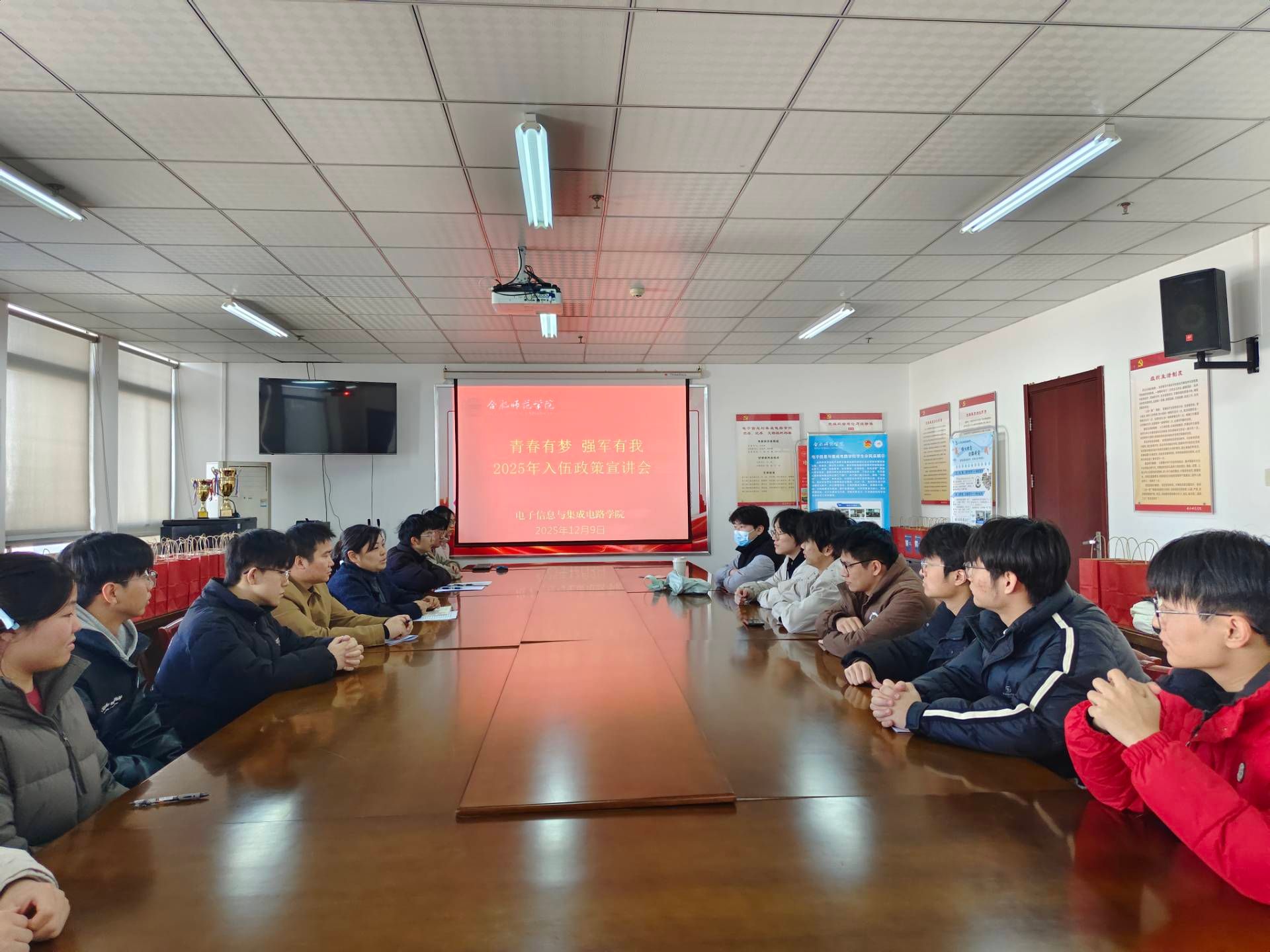 为深入贯彻国家征兵政策,扎实推进国防教育,激发青年学子投身军营、报效祖国的热情,12月9日,电子信息与集成电路学院在锦绣校区组织召开“青春有梦 强军有我”2026届毕业生应征入伍政策宣讲会。学院党委副书记、毕业班辅导员及有志参军的毕业生齐聚现场,共话军旅理想。