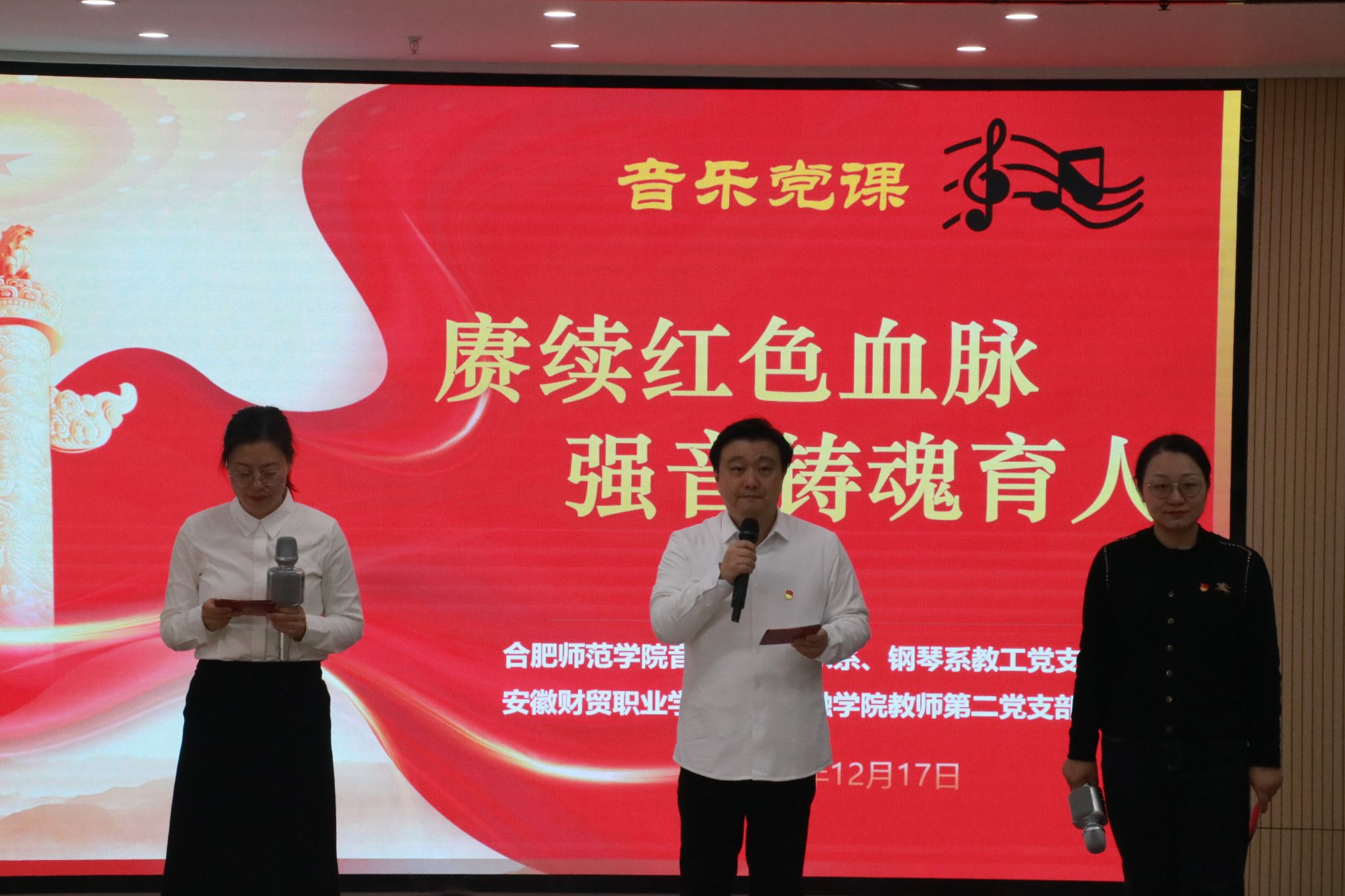 12月17日,由音乐学院声乐系、钢琴系教工党支部与安徽财贸职业学院财会金融学院教师第二党支部以党建联建的形式,共同开启了以“赓续红色血脉,强音铸魂育人”为主题,纪念中国人民抗日战争胜利80周年的音乐党课在安徽财贸职业学院顺利开展。省供销社一级巡视员魏邦余、安徽财贸职业学院党委书记张志祥、省供销社机关党委专职副书记陈雷等领导出席本次活动。