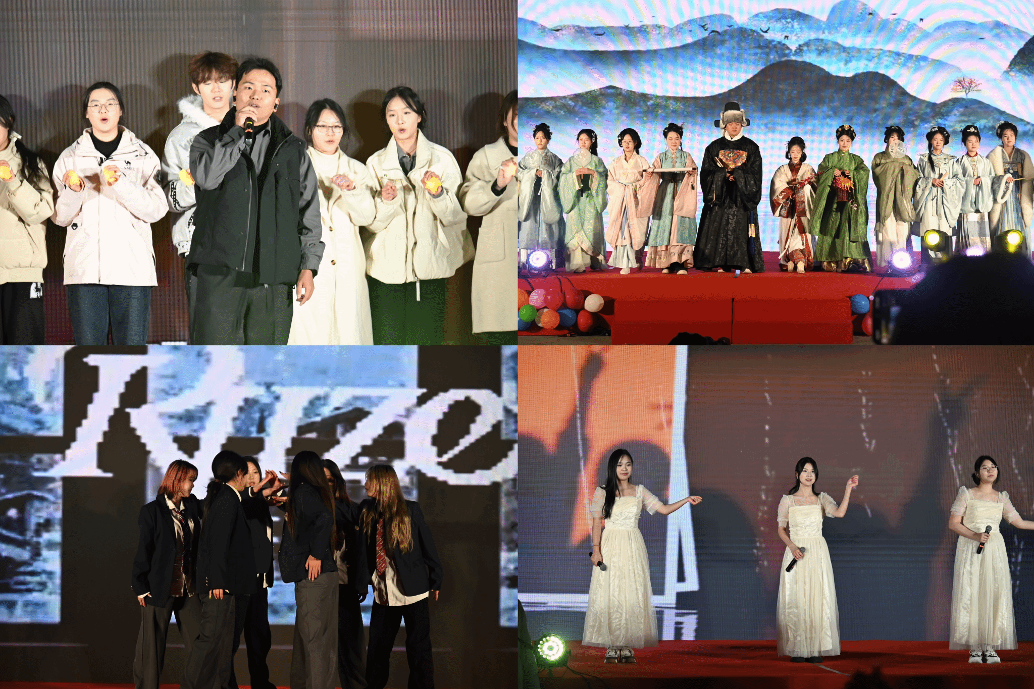 暮色渐浓,灯光璀璨,开场歌曲《一路生花》悠扬响起,元旦晚会正式拉开帷幕。直播镜头流畅切换,将舞台的绚丽光影与观众的热情笑颜实时传递至云端,吸引了大量线上观众点赞互动。三个篇章层层递进,演绎青春风采,传递家国情怀。“新岁序章·青春舞曲”中,乐队表演《鲜花+改变自己》点燃全场热情,鼓点与旋律交织成最鲜活的青春乐章;双人舞蹈《enjoy tonight》舞姿灵动,舞步蹁跹间尽显少年意气;独唱《天后》深情婉转,合唱《不遗憾》温暖治愈。“国风汉韵·民舞京戏”篇章,一场传统文化的视听盛宴徐徐展开。民族舞蹈《阿图什》勾勒出异域风情,舞姿舒展间尽显文化交融之美;汉服走秀《霓裳贺岁》衣袂翻飞,绫罗绸缎间重现华夏礼仪之邦的典雅风韵;《游园惊梦》串烧舞蹈将古典戏曲与现代舞蹈完美融合,一颦一笑、一招一式皆韵味悠长。“烟火星辰·岁岁皆安”篇章,温情与激情交织,定格团圆与希冀。小品《扰民了您》诙谐幽默,以生活化的剧情引发全场共鸣;街舞《love119》活力四射,以动感舞步点燃冬日激情;文学院合唱团带来的《起风了》串烧,旋律悠扬,歌声嘹亮,将晚会氛围推向高潮。