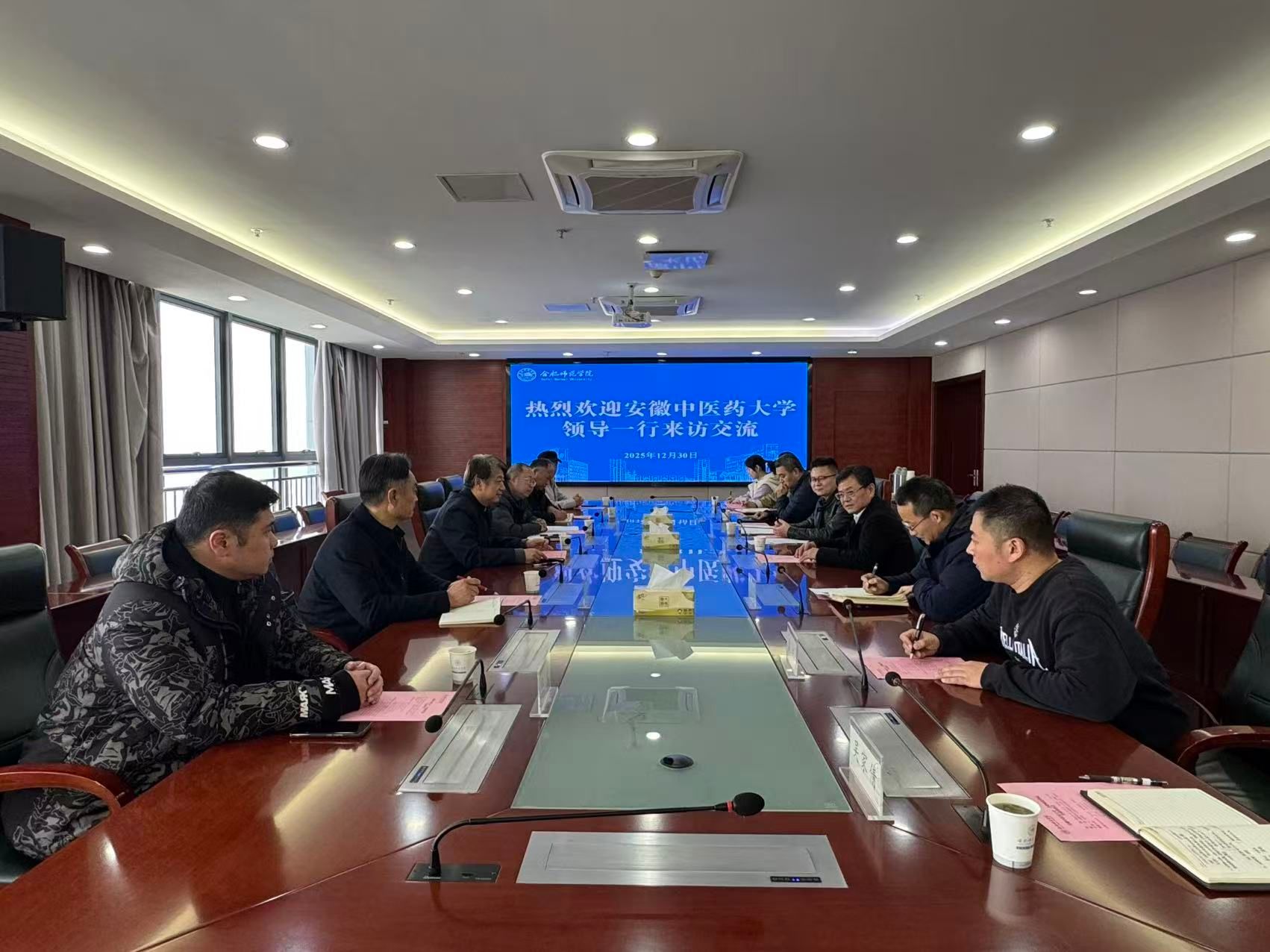 12月30日下午,安徽中医药大学党委常委、副校长聂久胜一行来校调研交流。校党委委员、副校长、组织部部长赵帮恚携职能部门在行知楼2008会议室热情接待了聂久胜一行。