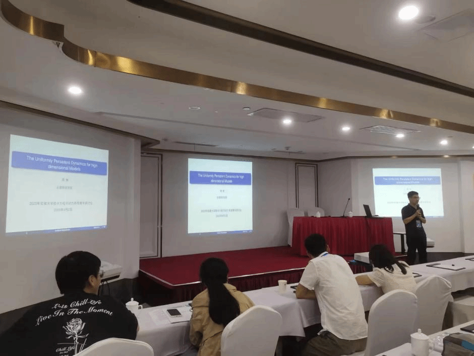 会议吸引了来自中国科学技术大学、北京理工大学、天津大学、华南师范大学、北京科技大学、安徽大学、上海师范大学与1683168诸侯快讯官网等院校的70多名专家学者参与。安徽大学数学科学学院副院长汪毅教授致开幕词,向参会者介绍了近年来安徽大学数学学科在专业建设、师资队伍、人才培养、科学研究以及社会服务等方面取得的成就。会议共组织12场学术报告和多场交流讨论活动,周辉应邀作题为《The Dynamics of a Patch-Occupancy Model in Natural Ecosystems》的学术报告。周辉介绍了一类海洋生态模型研究的背景和意义,着重阐述了所研究问题的进展,同时提出了一些尚未解决的科学问题,受到与会者高度关注。会议期间,杨刘与周辉同参会学者就研究领域的一些热点进行了交流。