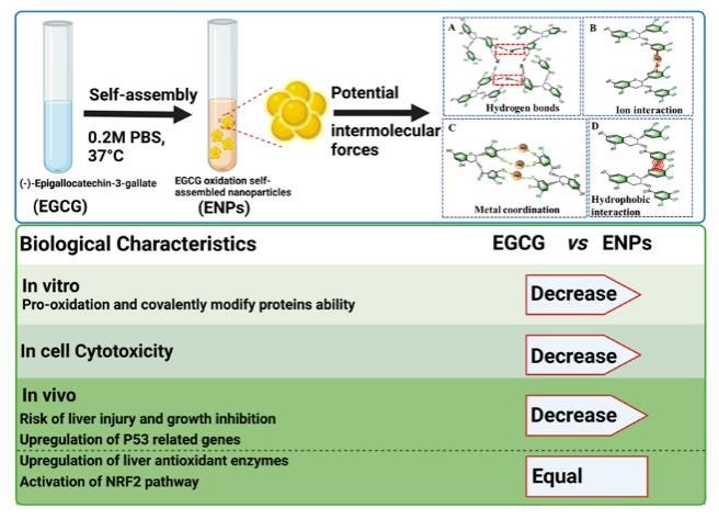 论文证明了在弱碱性条件下EGCG自氧化过程中形成了均匀的自组装纳米粒子(即ENPs),并揭示了维持ENPs稳定性的主要分子间驱动力。