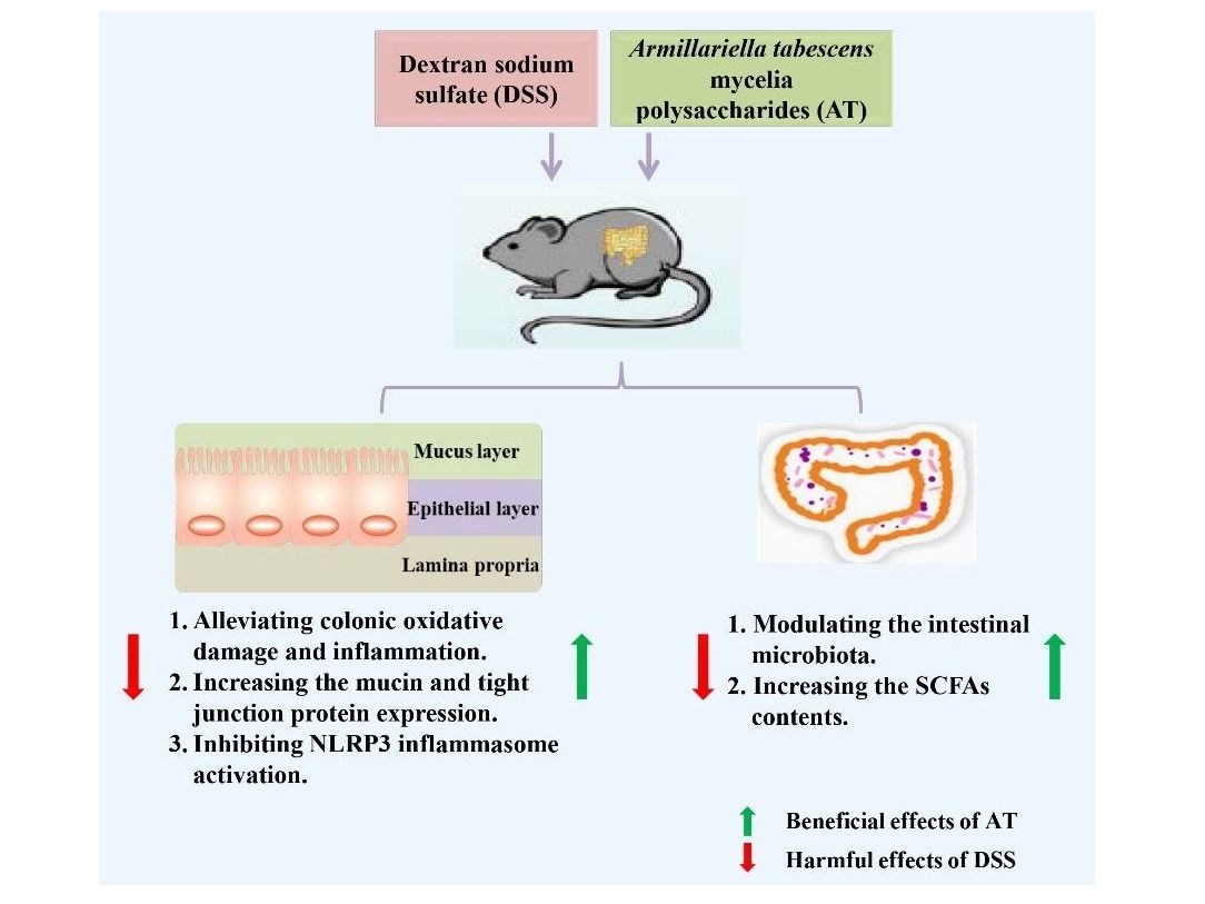 溃疡性结肠炎(UC)属于炎症性肠病(IBD)的一种,是一种病因尚不十分清楚的结肠和直肠慢性非特异性炎症性疾病。亮菌,又称假蜜环菌,其菌丝体中含有的多糖成分具有较好的抗炎作用。然而,亮菌菌丝体多糖(AT)对UC的影响尚未阐明。研究人员利用葡聚糖硫酸钠(DSS)建立UC小鼠模型,分别给予低、高剂量的AT进行灌胃干预。发现AT改善了UC小鼠的一般症状、减轻小鼠结肠的氧化应激和炎症反应。AT干预还可以改善UC小鼠结肠组织中紧密连接蛋白Claudin-1和occludin的表达,并上调结肠组织黏蛋白的表达,促进了结肠屏障功能的恢复。