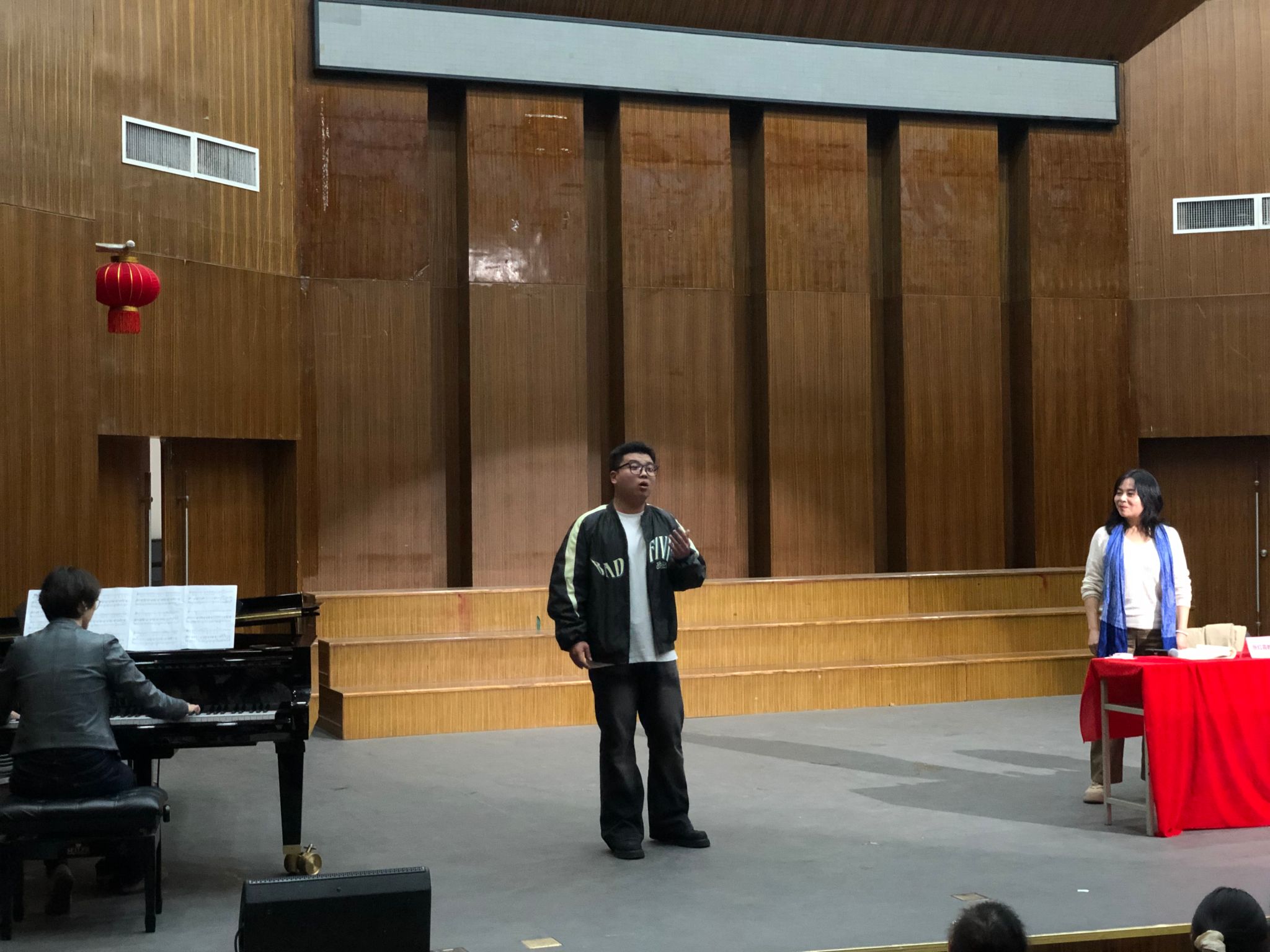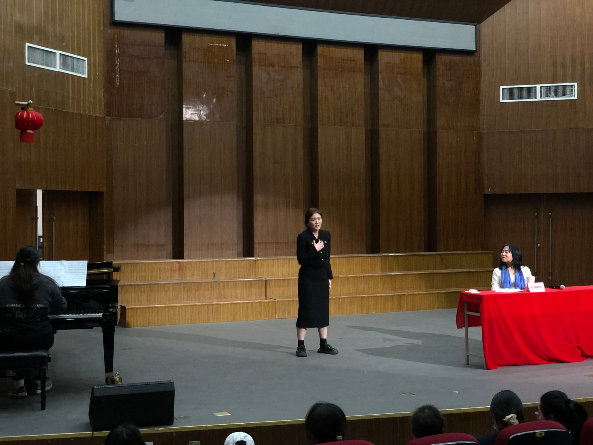 讲座的下半场,张教授聆听了我院三位学生的演唱。三位学生各自演唱了一首中文或外文的声乐作品。张教授肯定了每个人的长处,指出了各自存在的问题,并进行了演唱示范和针对性的指导。学生声音的显著变化也博得了观众阵阵掌声。在场的老师同学纷纷表示受益匪浅。