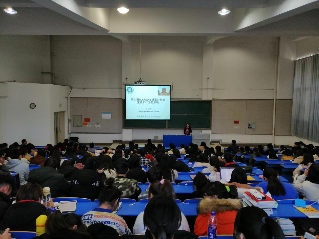 王玉凤教授首先对沃尔巴克氏体Wolbachia的研究作了简要概况,她指出沃尔巴克氏体Wolbachia属于变形菌纲Proteobacteria的α亚群,为革兰氏阴性细菌,具有杆状和球状两种形态。它普遍存在于节肢动物和线虫中,对宿主的生殖、发育、行为等产生多种影响。接着以果蝇为例,通过大量实验数据图表,就其致病机制以及沃尔巴克氏体对宿主寿命、取食、嗅觉、繁殖、免疫调节等多方面的影响进行详细阐述。最后,王教授就华中师范大学的学校概况跟大家进行了介绍。现场气氛热烈。