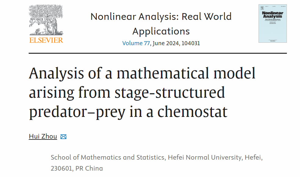 近期,数学与统计学院“基础数学”省级重点学科微分方程与动力系统团队教师周辉在恒化器中具年龄结构的捕食-被捕食系统数学模型的动力学分析领域取得进展,相关成果Analysis of a mathematical model arising from stage-structured predator–prey in a chemostat在JCR二区期刊《Nonlinear Analysis: Real World Applications》公开发表。