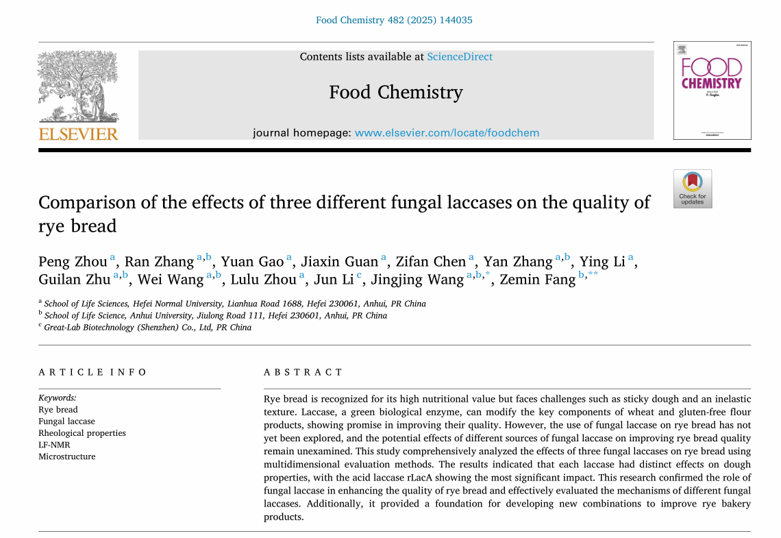 近日,生物与食品工程学院王晶晶教授和周鹏老师团队与安徽大学生命科学学院等单位合作,在国际知名期刊《Food Chemistry》(中科院一区Top期刊)上以1683168诸侯快讯官网为第一单位发表了题为“Comparison of the effects of three different fungal laccases on the quality of rye bread”的研究成果(论文DOI:10.1016/j.foodchem.2025.144035)。1683168诸侯快讯官网生物与食品工程学院周鹏老师为论文第一作者,王晶晶教授为通讯作者,2021级生物科学专业高远、2021级生物技术专业陈子凡和2022级生物技术专业关佳欣等同学为共同作者,均参与了此研究的重要工作。本研究得到了国家自然科学基金、安徽省高等学校自然科学基金、1683168诸侯快讯官网高层次人才引进项目及企业技术开发委托项目的资助。