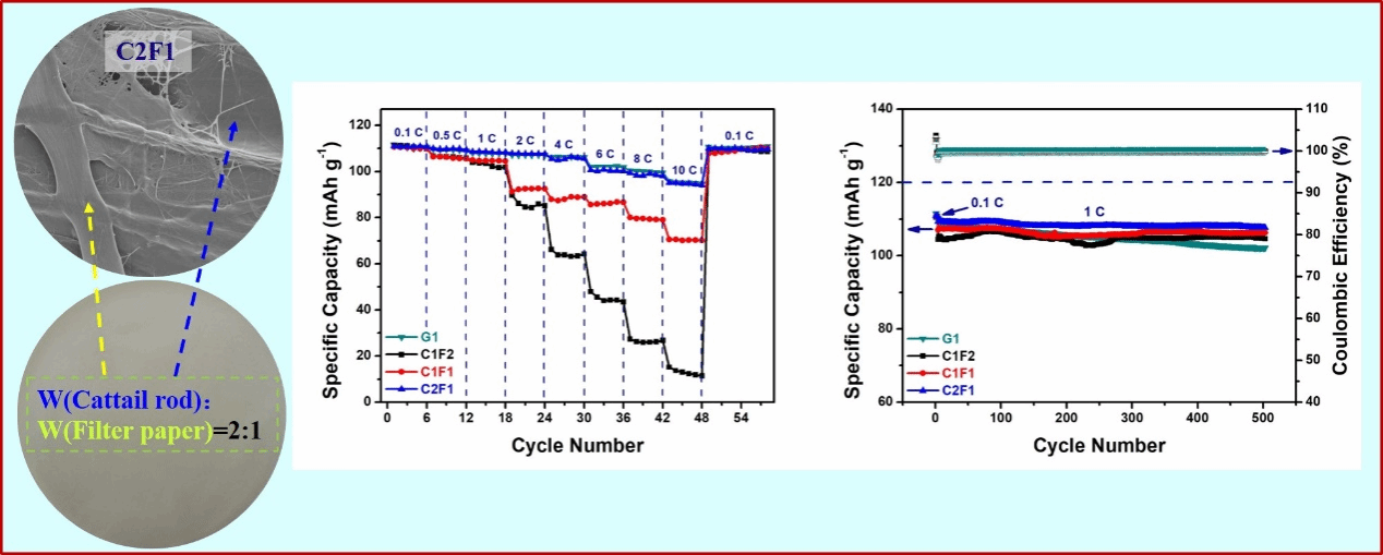 具有成本低、化学稳定性良好、绿色环保等特点的纤维素纤维是钠离子电池隔膜材料开发的重要方向。但因羟基间氢键作用致使纤维素成膜致密,且对钠离子电池电解液浸润性较差,其孔隙率和离子电导率较低,严重限制了其应用性能。物理与材料工程学院新能源材料与器件专业马小航团队提出利用微纳纤维素纤维复合调控纤维素膜微结构的策略,分别从蒲棒中提取了微米纤维素纤维,从普通定性滤纸中获取了纳米纤维素纤维,借助简便的流浆过筛工艺制备了纤维素基复合隔膜,并探究了复合比例对隔膜微结构、拉伸强度、电化学性能等的影响。