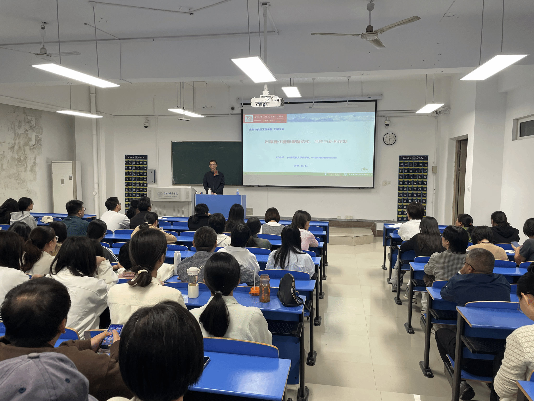 整场报告逻辑清晰、内容详实,赵金华用专业且易懂的语言,将复杂的学术知识传递给在场师生。教师们结合自身教学与科研工作积极思考,2023级生物制药专业学生也认真记录、踊跃汲取前沿学术养分。此次报告不仅为师生搭建了学习交流的平台,助力大家了解天然产物糖化学与创新药物研发领域的最新动态,也进一步加强了校友与母校的联系,为学院学科发展与人才培养注入新动力。(生物与食品工程学院:蔡旭冉)