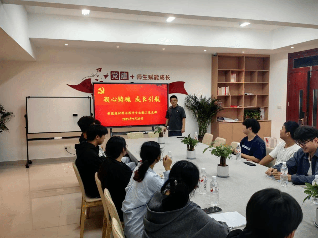 为开阔学生学术视野,促进学术交流,9月29日下午在滨湖校区学院一站式社区,物理与材料工程学院新能源材料与器件专业教工党支部与学生党支部联合举办“凝心铸魂,成长引航”学术报告,新能源材料与器件专业学生代表参加 。