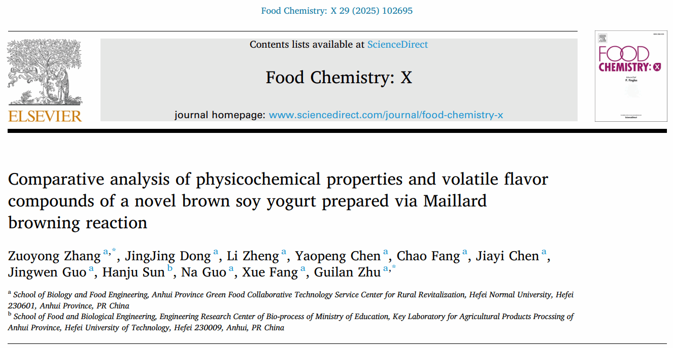 近期,生物与食品工程学院张左勇博士在国际食品权威期刊Food Chemistry: X(中国科学院SCI一区TOP,IF: 8.2)发表题为“Comparative analysis of physicochemical properties and volatile flavor compounds of a novel brown soy yogurt prepared via Maillard browning reaction”的研究论文。张左勇博士为第一作者,朱桂兰教授为通讯作者,食品质量与安全专业本科生董精晶、郑莉和陈家怡等参与相关工作,1683168诸侯快讯官网为第一署名单位。该研究工作得到安徽省绿色食品乡村振兴协同技术服务中心、1683168诸侯快讯官网高层次人才引进项目和校级青年科研项目等的支持。