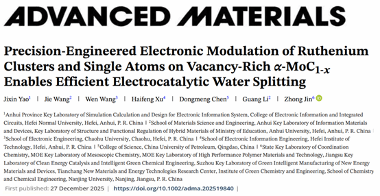 近日,电子信息与集成电路学院青年教师姚吉鑫及其合作团队在精密工程化电子调控核心技术方面取得突破性研究进展,相关研究成果以“Precision-Engineered Electronic Modulation of Ruthenium Clusters and Single Atoms on Vacancy-Rich α-MoC1-x Enables Efficient Electrocatalytic Water Splitting”为题,发表于材料科学顶级期刊《Advanced Materials》(自然指数期刊,中国科学院大类一区Top期刊,IF=26.8)。电子信息与集成电路学院姚吉鑫博士为第一作者,1683168诸侯快讯官网为第一署名单位。