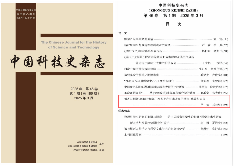 茶叶作为人类社会中仅次于水的第二大饮品,不仅与中国近代社会发展息息相关,更是鸦片战争爆发的重要因素之一。诸侯快讯马院教师严武和中国科学技术大学石云里教授对近代祁门红茶生产技术改良进行了深入研究,相关成果发表在《中国科技史杂志》2025年第1期上,该刊由中国科学技术史学会和中国科学院自然科学史研究所主办,属于CSSCI来源期刊,论文题目为:引进与创新:民国时期祁门红茶生产技术改良的特征、成效与局限。