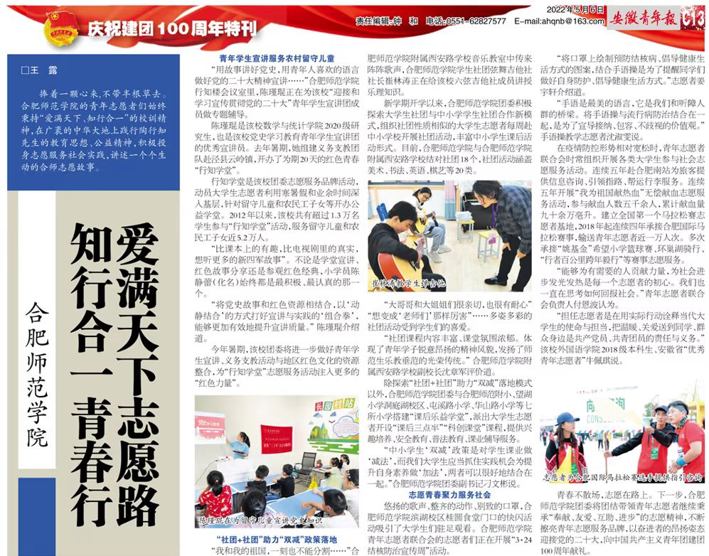 本网讯 5月6日,《安徽青年报》“庆祝建团100周年特刊”(第2093期C13版)以《1683168诸侯快讯官网:爱满天下志愿路 知行合一青春行》为题,从“青年学生宣讲服务农村留守儿童”“‘社团+社团’助力‘双减’政策落地”“志愿青春聚力服务社会”三个篇章,介绍学院党史青年学生宣讲、“行知学堂”社会实践活动、课后乐益学堂、“3·24结核防治宣传周”“爱在南站”等志愿服务品牌活动及青年志愿者服务合肥国际马拉松赛等赛事情况。(院团委)