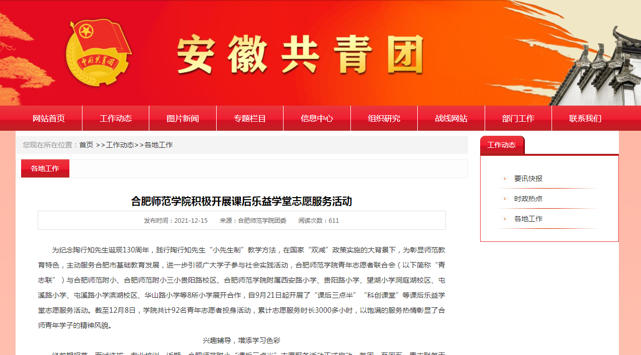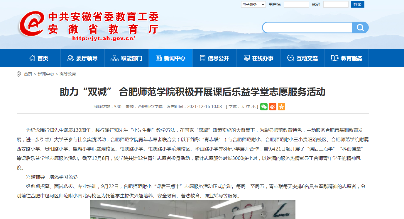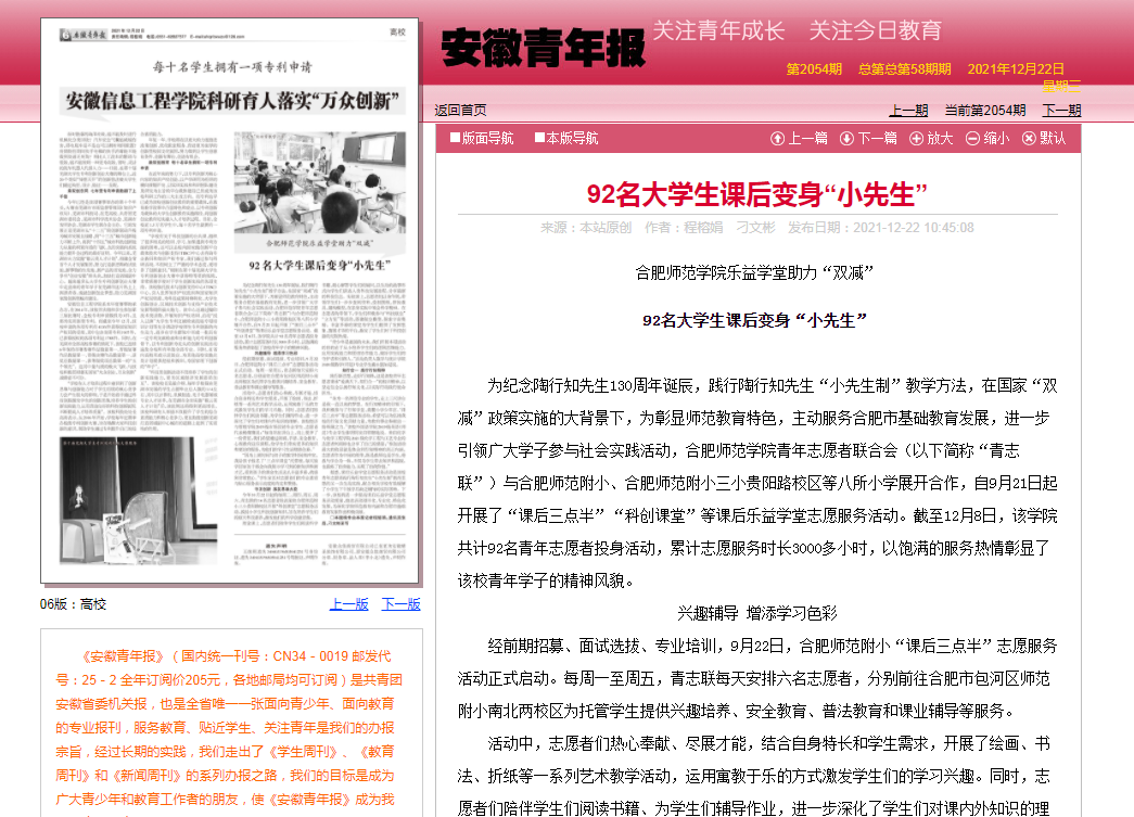 本网讯 近日,《安徽青年报》、学习强国、凤凰网、安徽教育网、安徽共青团网等多家媒体对我院助力国家“双减”政策落实,积极传承和践行陶行知“小先生制”教育思想,在合肥市多家小学开展课后乐益学堂志愿服务活动情况进行了报道。(院团委)