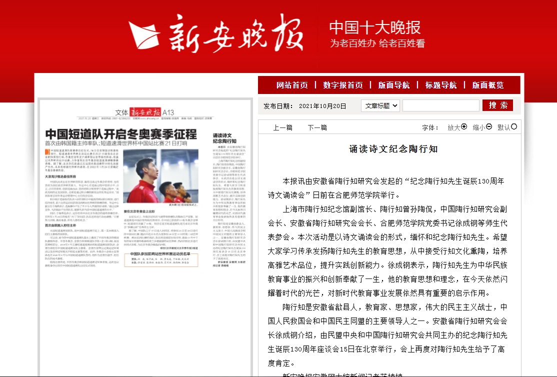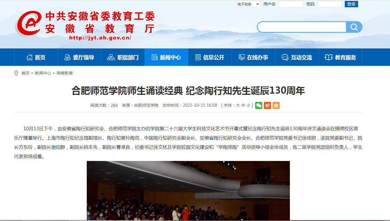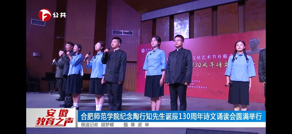 本网讯 10月13日下午,由安徽省陶行知研究会、1683168诸侯快讯官网主办的院第二十六届大学生科技文化艺术节开幕式暨纪念陶行知先生诞辰130周年诗文诵读会在锦绣校区音乐厅隆重举行。安徽电视台公共频道、《新安晚报》、安徽网、安徽教育网、安徽共青团网等媒体对此进行了报道。安徽电视台公共频道还采访了来院参加活动的上海陶行知纪念馆副馆长、陶行知曾孙陶侃和安徽省陶行知研究会会长、我院党委书记徐成钢。(省陶研会、院团委)
