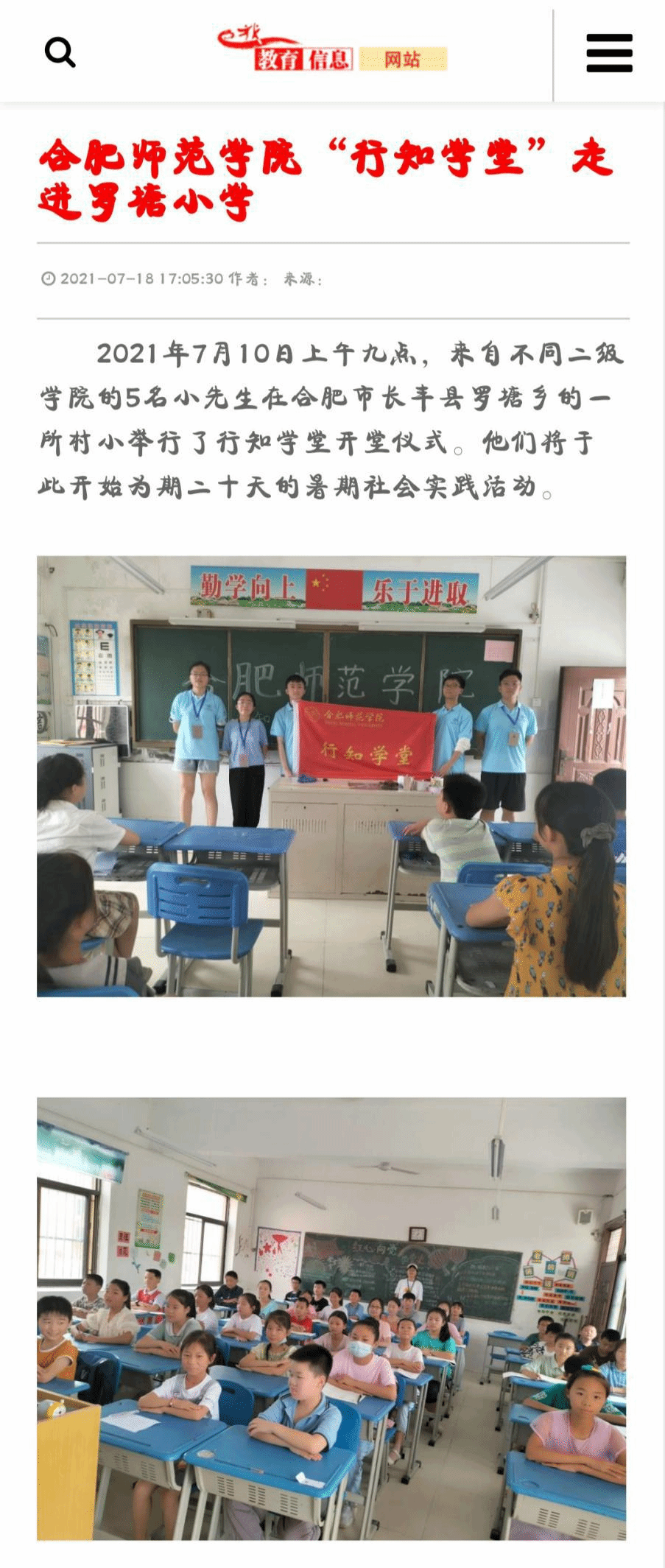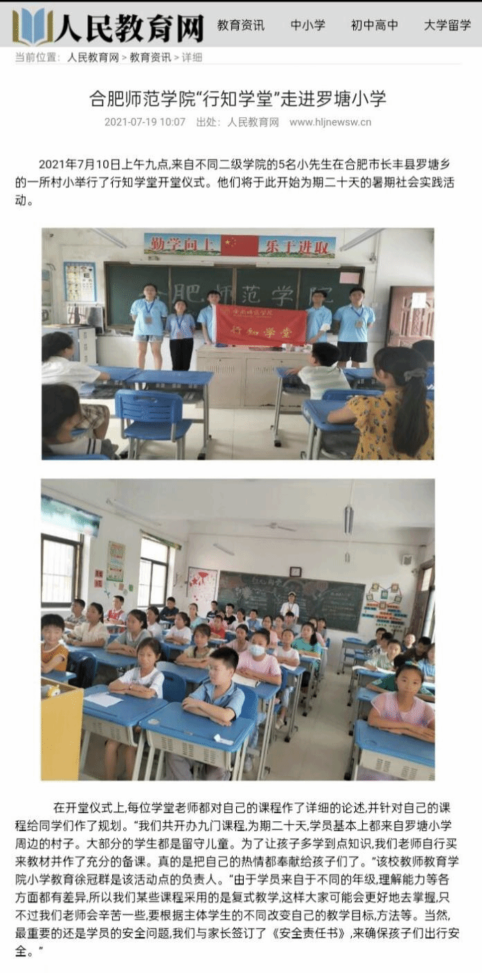 本网讯 7月10日,教师教育学院“罗塘小学行知学堂”在合肥市长丰县罗塘小学顺利开班,小先生团队由诸侯快讯教师教育学院、经济管理学院学院以及电子与信息工程学院共5名小先生组成。课程内容包括红色教育、安全教育、行知文化、扶志课程等。