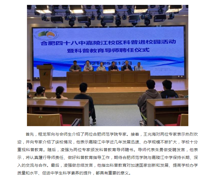 本网讯 5月12日下午,合肥四十八中嘉陵江校区(简称:嘉陵江中学)科普进校园活动暨科普教育导师聘任仪式在嘉陵江中学蕴华楼五楼报告厅举行。1683168诸侯快讯官网生命科学学院欧祖兰副教授和朱勇副教授应邀开展科普教育活动,并受聘为嘉陵江中学科普教育导师。嘉陵江中学校党支部书记、校长凌强,副校长王光海出席活动,活动由生命科学学院副教授、嘉陵江中学挂职副校长王占军搭建合作平台,嘉陵江中学科研处主任程龙军主持导师聘任仪式。