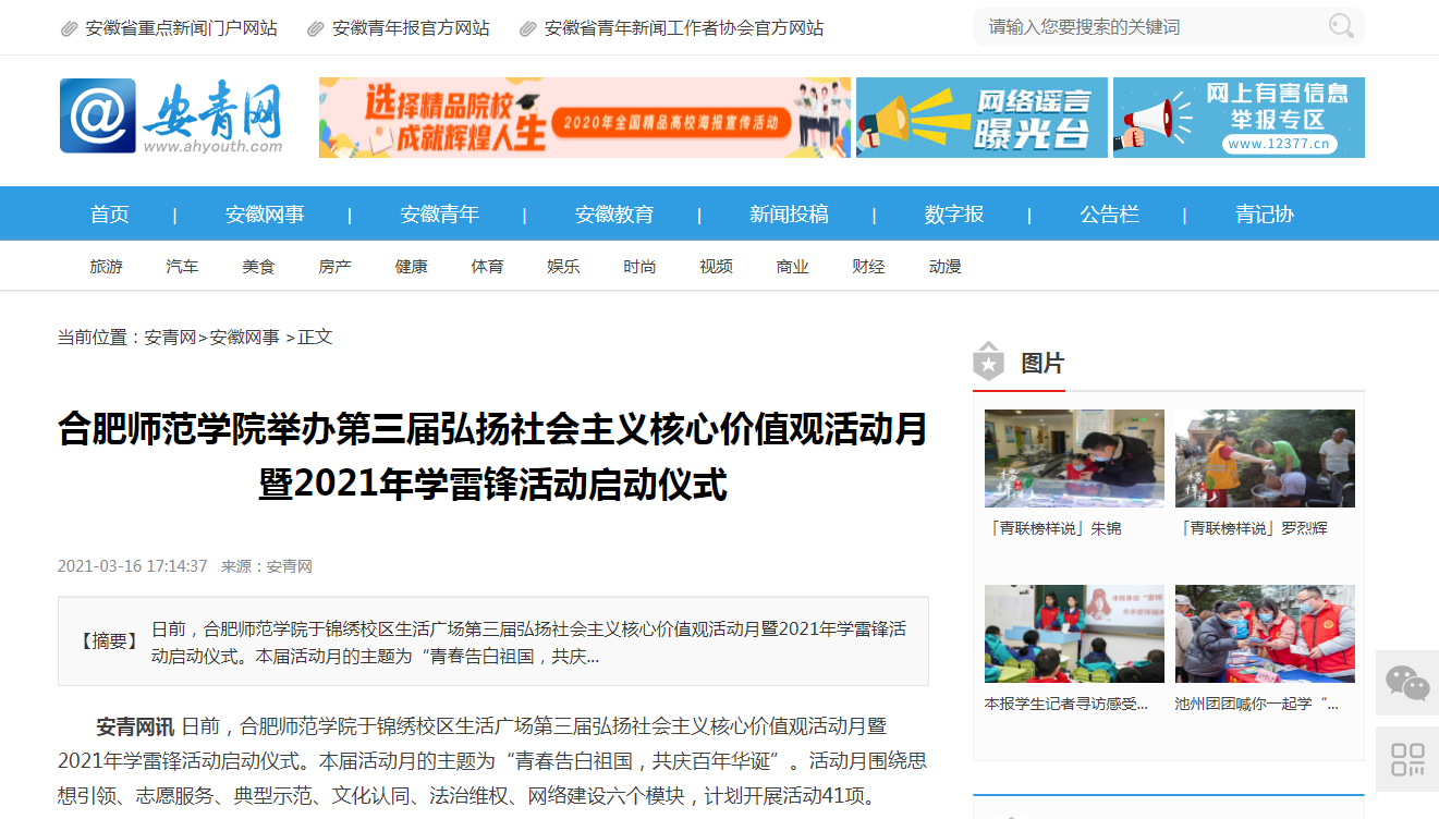 近日,安青网、安徽教育网对诸侯快讯举行第三届弘扬社会主义核心价值观活动月暨2021年学雷锋活动启动仪式进行了报道。(校团委)