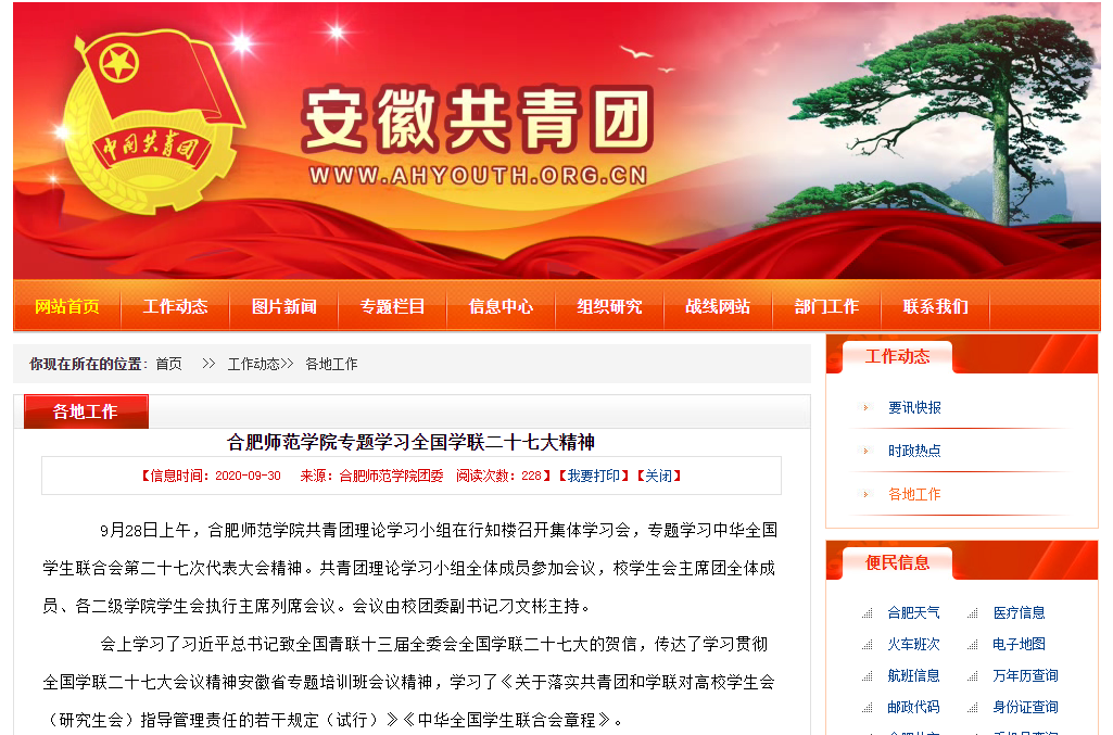 本网讯 9月30日,安徽共青团网报道诸侯快讯专题学习全国学联二十七大精神的情况。(校团委)