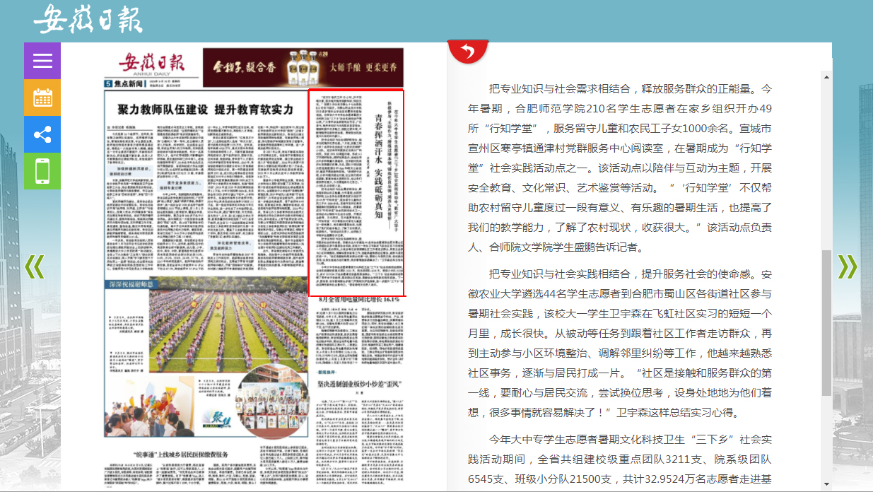 9月10日,安徽日报在第5版《青春挥洒汗水 实践砥砺真知》中,对我院2020年暑期“行知学堂”实践活动进行了报道,这是今年安徽日报连续第二次报道我院暑期“行知学堂”实践活动。(院团委)
