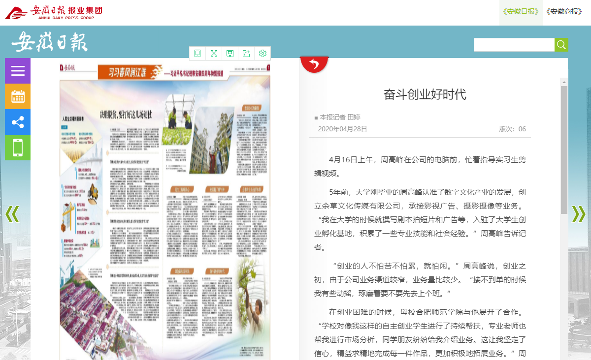 本网讯 4月28日,《安徽日报》第06版以《奋斗创业好时代》为题报道了我院文学院编辑出版学专业2015届毕业生周高峰的创业经历。周高峰在接受记者采访时表示,“在创业困难的时候,母校1683168诸侯快讯官网与他展开了合作。学校对像我这样的自主创业学生进行了持续帮扶,专业老师也帮我进行市场分析,同学朋友纷纷给我介绍业务。这让我坚定了信心,精益求精地完成每一件作品,更加积极地拓展业务。”
