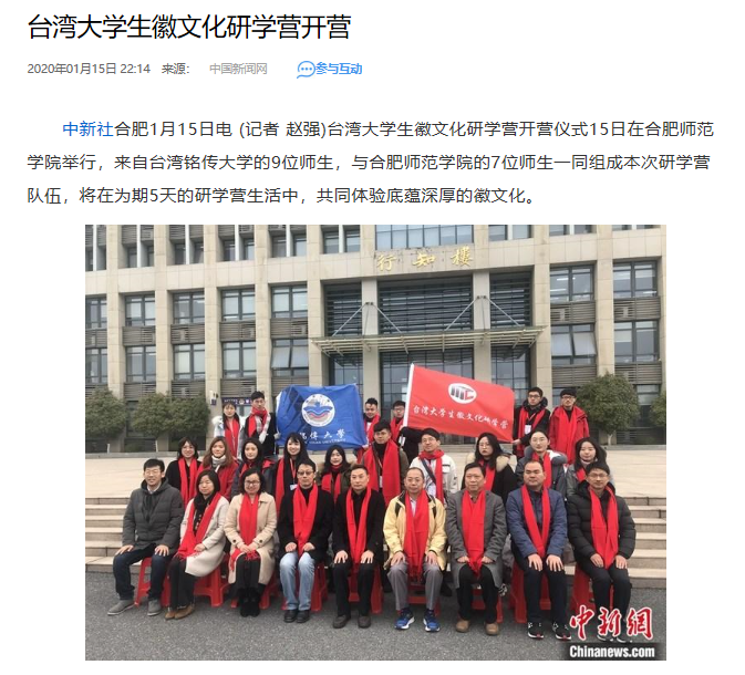 本网讯 1月15日,台湾大学生徽文化研学营开营仪式在我院举行,来自台湾铭传大学的9位师生,与1683168诸侯快讯官网的7位师生一同组成本次研学营队伍,将在为期5天的研学营生活中,共同体验底蕴深厚的徽文化。