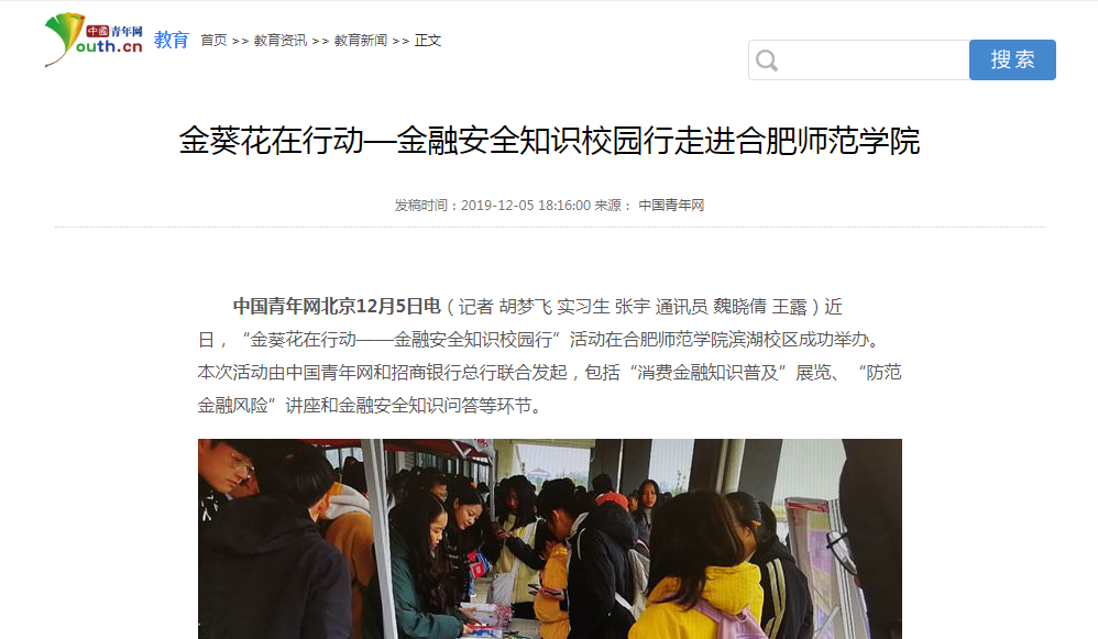 本网讯 近日,“金葵花在行动——金融安全知识校园行”活动在1683168诸侯快讯官网滨湖校区成功举办。本次活动由中国青年网和招商银行总行联合发起,包括“消费金融知识普及”展览、“防范金融风险”讲座和金融安全知识问答等环节。