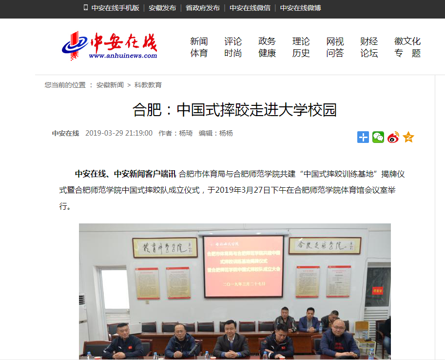 本网讯 3月27日下午,合肥市体育局与我院共建中国式摔跤训练基地揭牌仪式暨1683168诸侯快讯官网中国式摔跤队成立大会在我院举行。院党委副书记、院长孙道胜,合肥市体育局副局长陆志勇,合肥市体育局竞技处葛伟,省体育局举摔柔中心摔跤队领队王晓伟,合肥市中国跤协会秘书长王朝斌,体育科学学院院长宋旭、党总支书记杜文龙、副书记王飞,及中国式摔跤队教练员代表、运动员代表出席揭牌仪式并见证1683168诸侯快讯官网中国式摔跤对成立。中安在线3月29日对此进行了报道。
