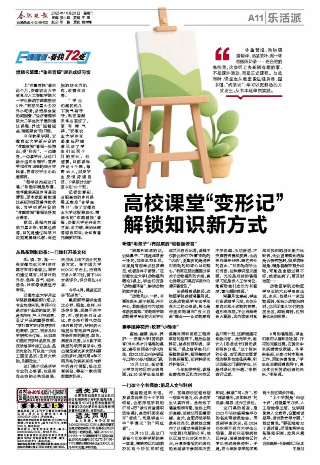 本学期“阅+历”读书讲堂在锦绣校区和滨湖校区同时举行,作为一门线下精品通识选修课程,旨在利用32个课时,尽可能帮助学生们扩大见识,拓展视野,发现兴趣点,实现“阅”(认知)与“历”(实践)的知行转化,培养读书好学的良好习惯。这种其创新模式与显著成效获不仅获得广大师生的认同与好评,也得到了社会媒体的高度关注。近日,合肥日报记者主动前来进行专题采访,并先后在《合肥日报》、《合肥晚报》上以《一门课十位老师教——联袂开讲览尽人文与科创》《高校课堂“变形记”,解锁知识新方式》为题进行了报道。